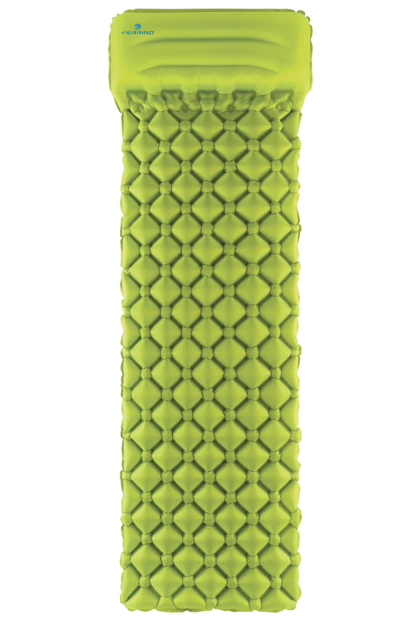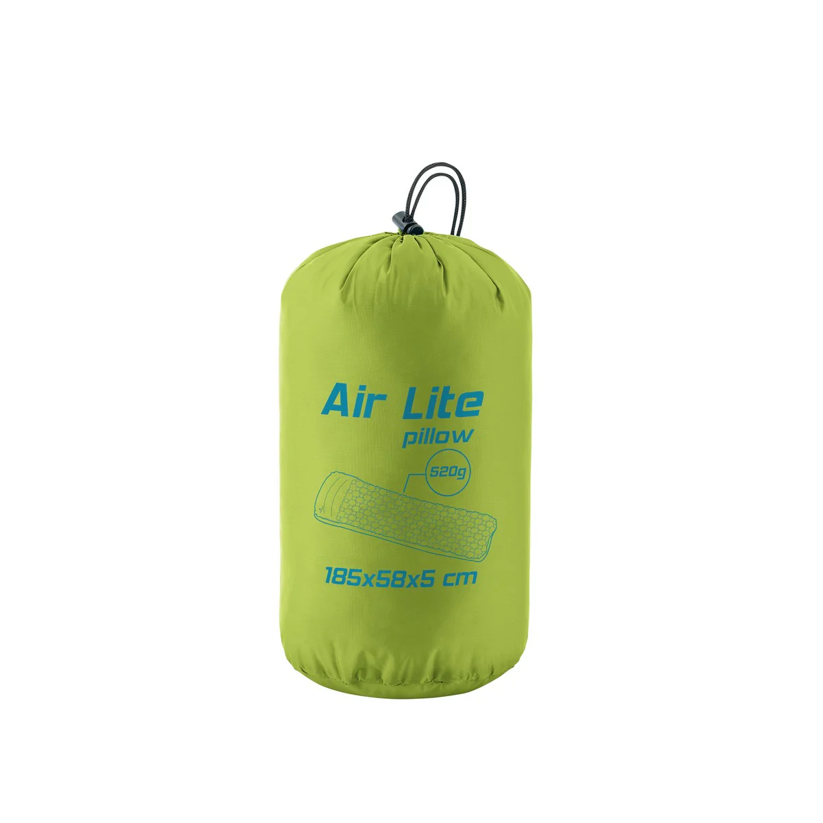 Colchón ligero de nylon 40D Ripstop (sin PFC) con almohada. Bomba para el inflado incluida que puede utilizarse también como funda. Medidas de la funda: diámetro 9×25 cm.