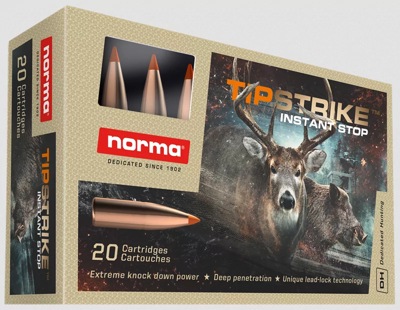 La bala Norma TipStrike de 280 REM y 160 gr está diseñada para caza con una punta blanda de plástico que asegura una rápida deformación y buena penetración.