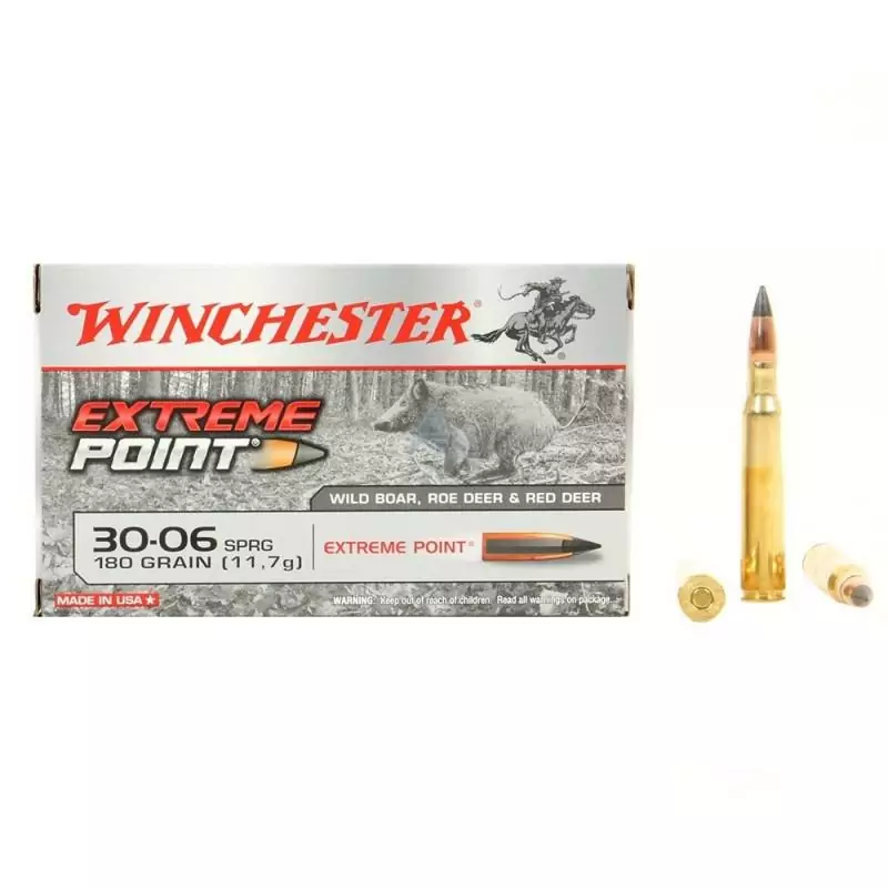 La bala Winchester Extreme Point para calibre .30-06, con 180 grains, presenta un diseño avanzado que utiliza un porcentaje elevado de su superficie frontal para una expansión superior.