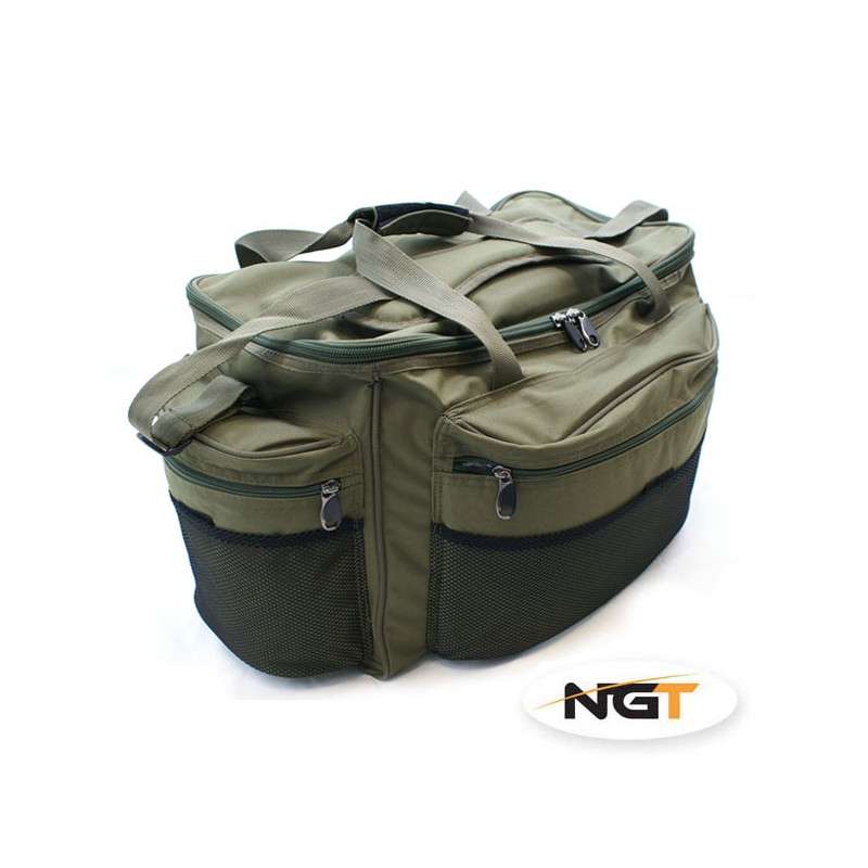 Bolso NGT Carryall 093 en color verde oliva, con 4 compartimentos, 3 bolsillos laterales, correa acolchada y asas de alta calidad. Fabricado en material resistente, ideal para pesca y actividades al aire libre.