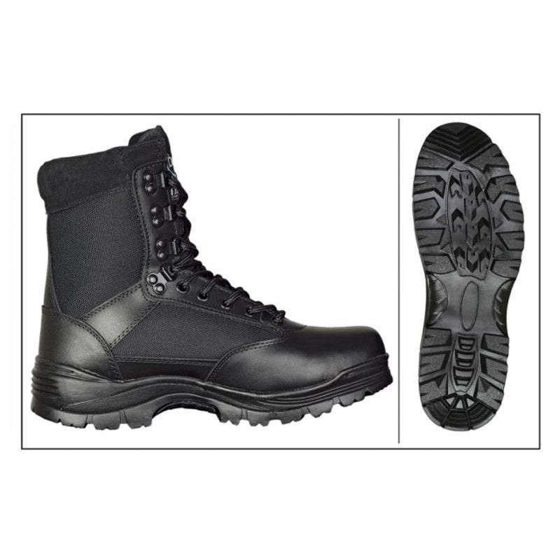 Estas botas tácticas presentan un piso ligero de caucho natural que ofrece una excelente tracción y durabilidad. La cordonera metálica asegura un ajuste firme y seguro, mientras que su diseño facilita el ponerlas y quitarlas rápidamente. Con un elegante color negro, estas botas son ideales para profesionales que necesitan un calzado robusto y confiable.
