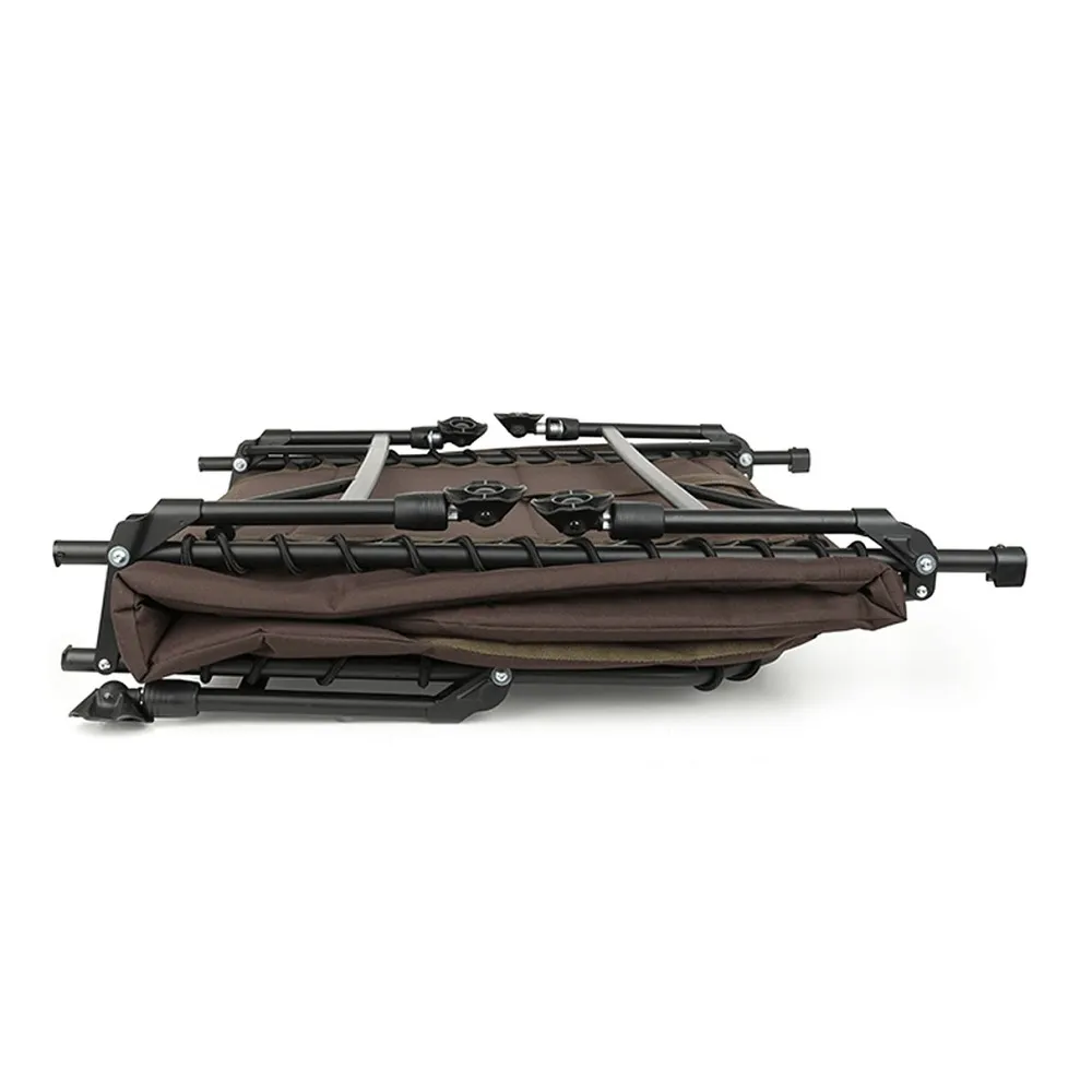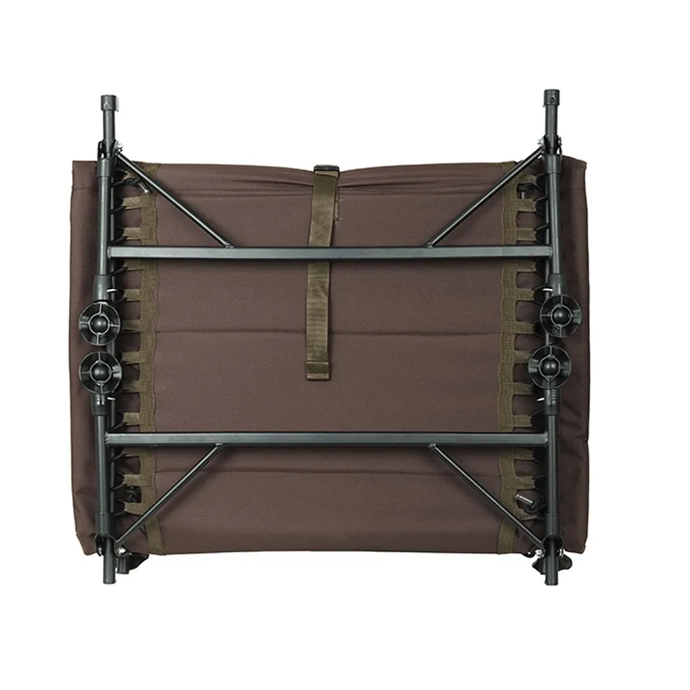 BEDCHAIR FOX EOS2: Diseño sin levas, colchón acolchado y estructura plana para confort premium en pesca.