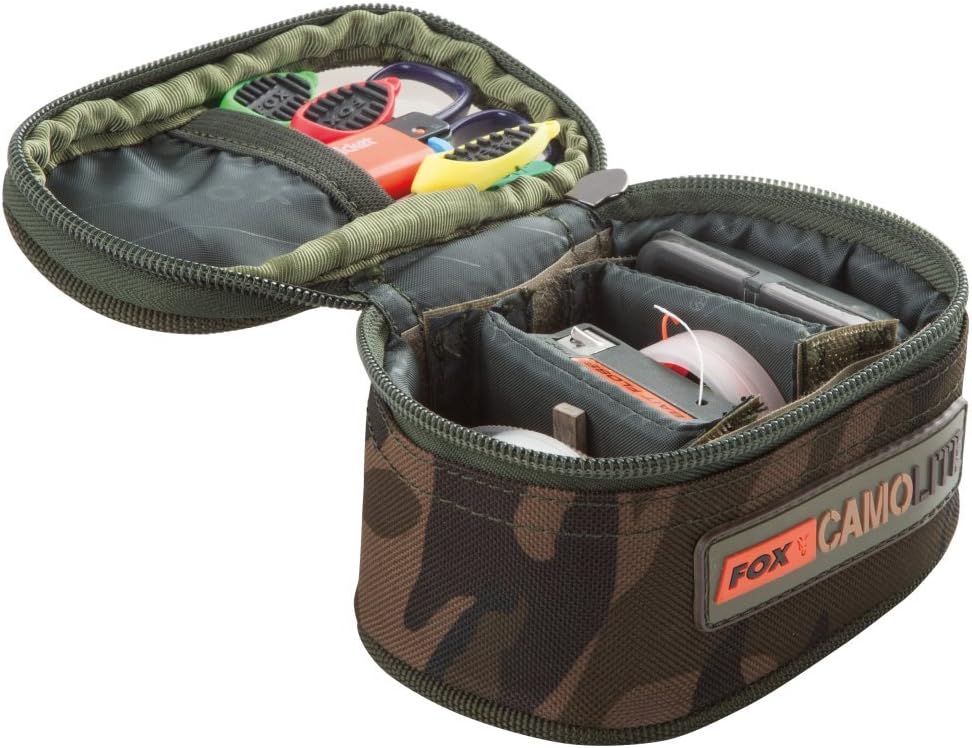 El CAMOLITE FOX MINI ACCESSORY POUCH presenta un exclusivo diseño con patrón Fox Camo. Equipado con cremalleras dobles de alta resistencia, 2 divisores internos ajustables y una tapa de PVC tintado con bolsillo de almacenamiento. Ideal como bolsa para cebar, manteniendo todo lo necesario sin sacar la caja de aparejos.
