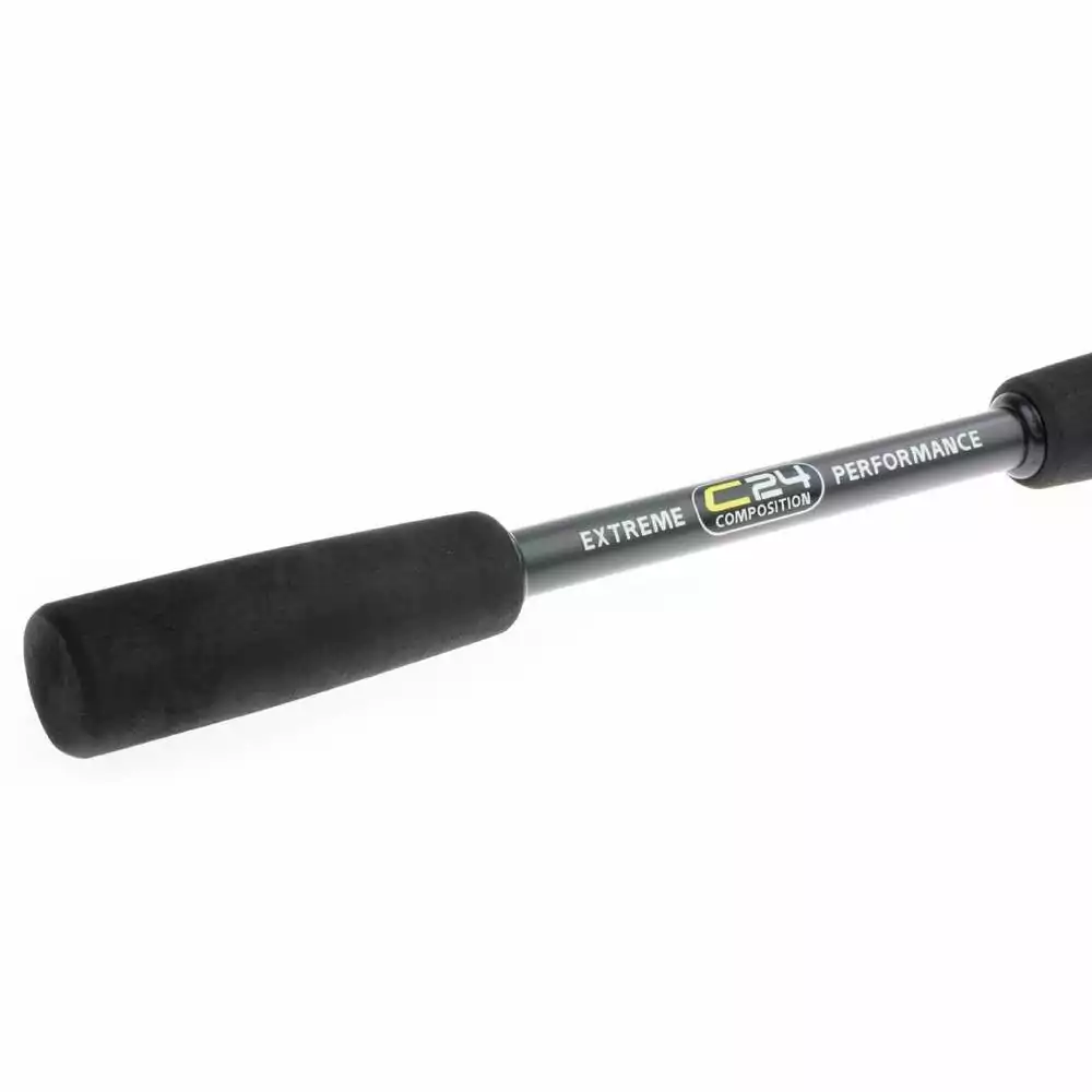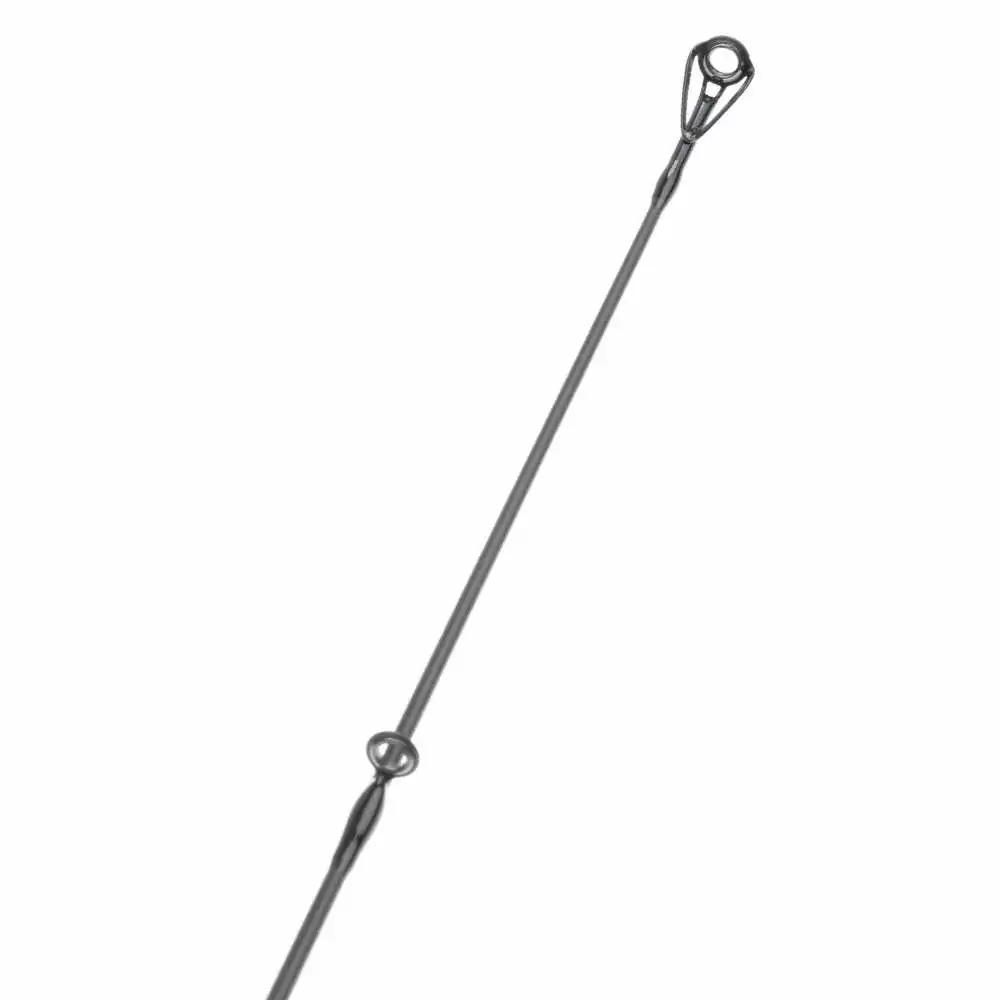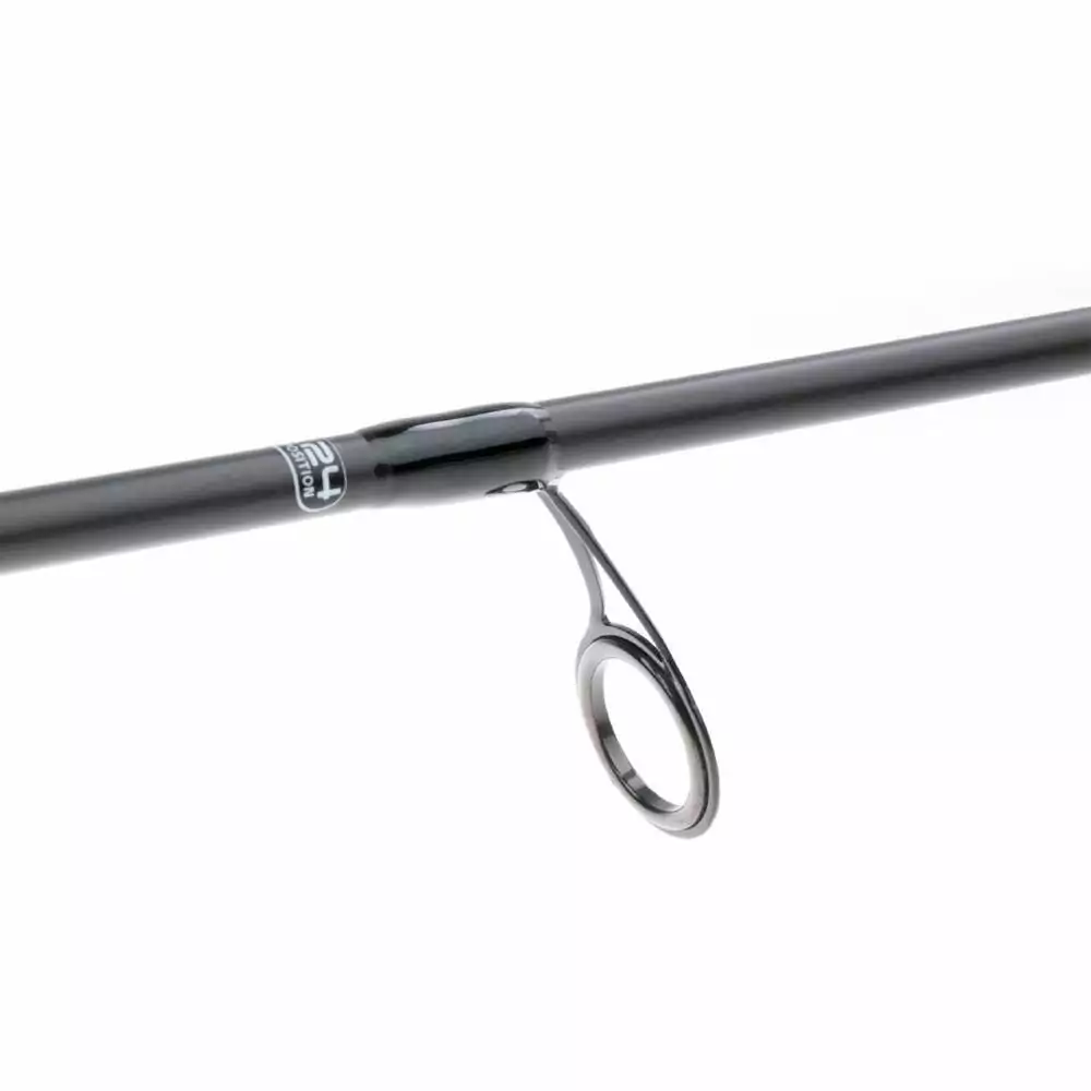 Fabricada con un blank tubular de carbono, está equipada con anillas monopata con cerámicas tipo O-ring, un portacarretes tipo VSS o TVS, y una anilla fija-anzuelos incorporada. Se entrega con una funda de tela para su protección.