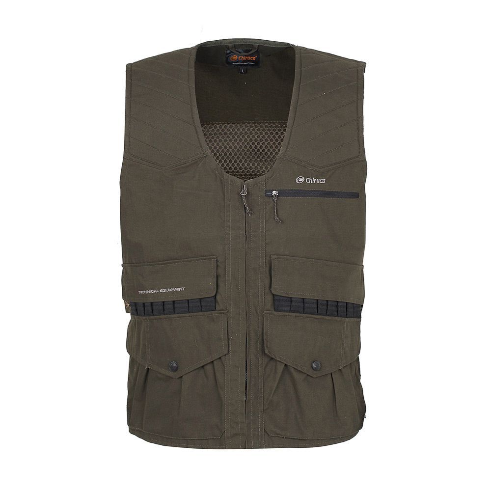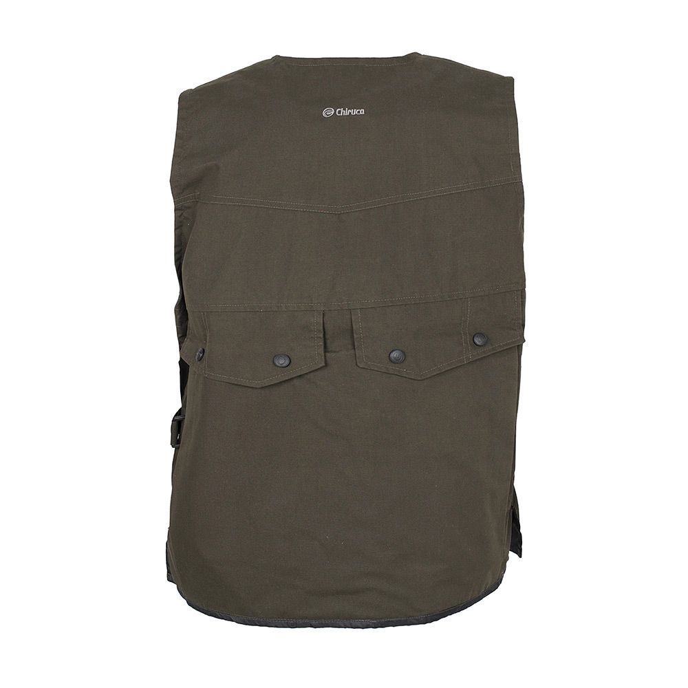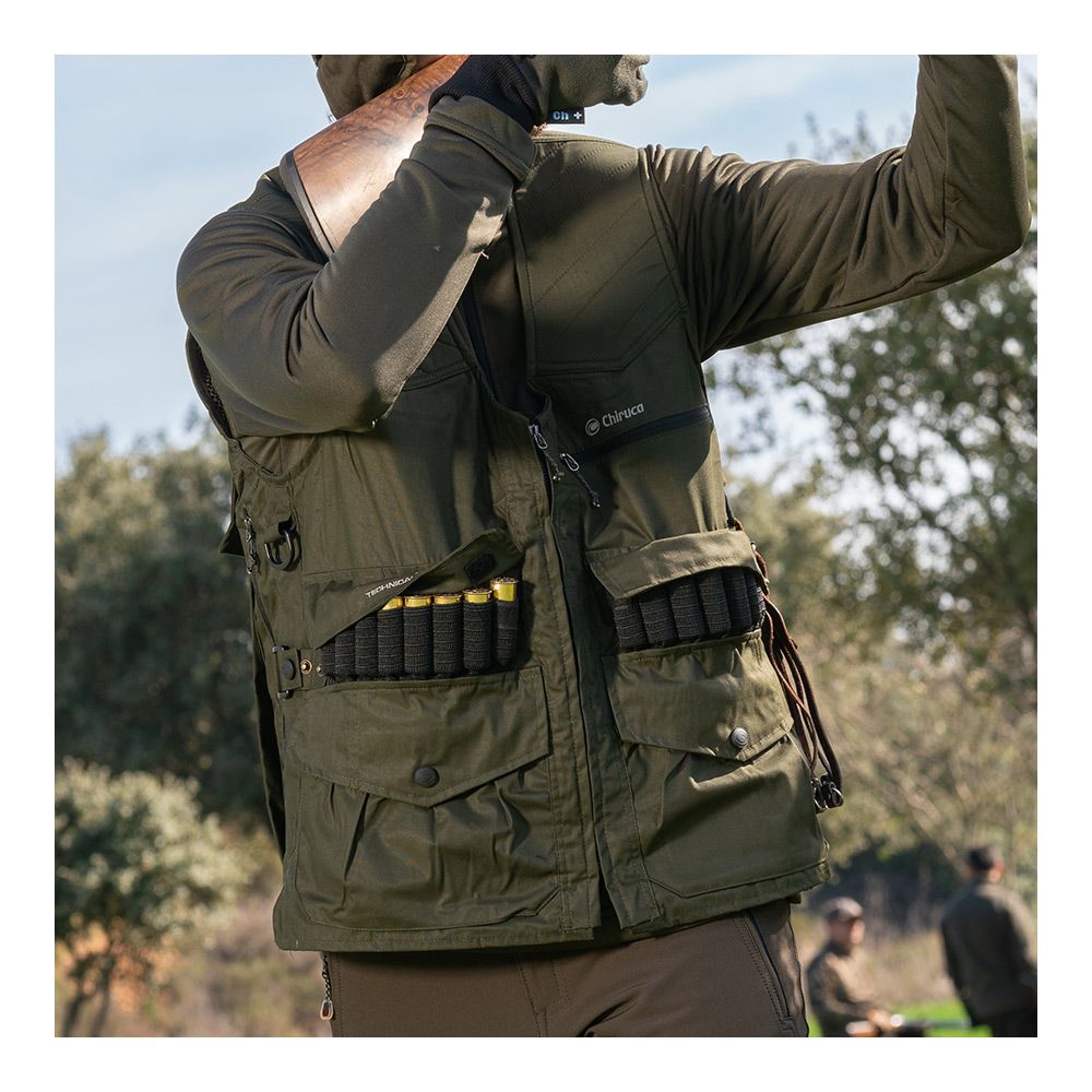 Presenta un bolsillo frontal para documentos con cierre de cremallera, bolsillos inferiores de gran capacidad con apertura elástica y cierre de botón, y cartucheras elásticas para 8 cartuchos en cada lado. Incluye anillas para piezas en ambos lados y un doble bolsillo morral impermeable con cierres de cremallera a ambos lados y una entrada doble superior con tapetes con botones. Su forro interior de malla, combinado con el forro personalizado Chiruca, proporciona ligereza y transpirabilidad.