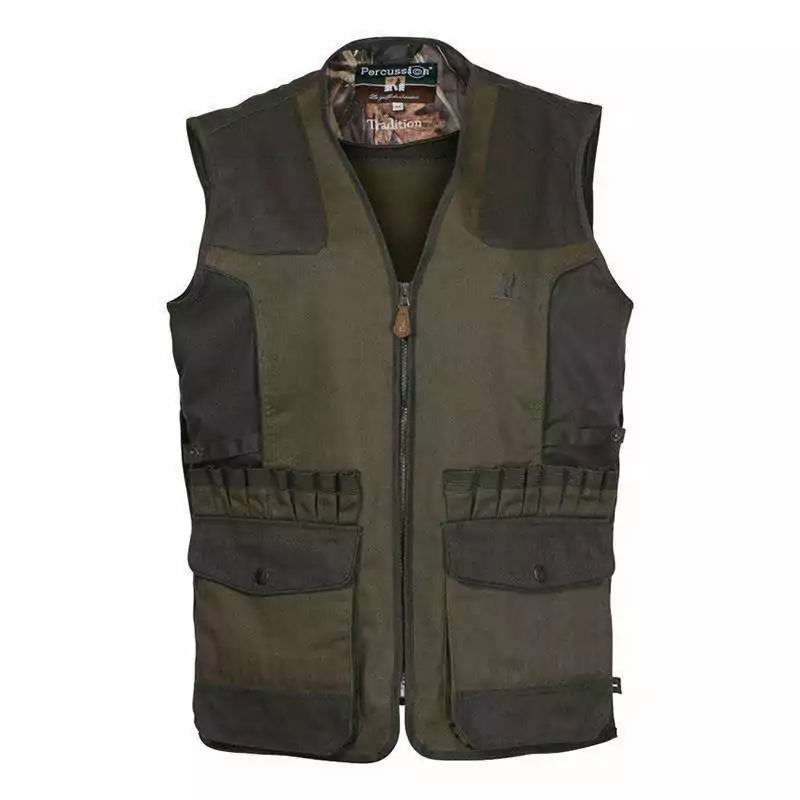El Chaleco de Caza Percussion Mod.1215 Gilet Tradition Brode combina funcionalidad y resistencia. Fabricado con un 65% de poliéster y un 35% de algodón, cuenta con un tratamiento hidrófugo para repeler el agua. El chaleco presenta refuerzos en los hombros, dos grandes bolsillos bajos con cartucheras integradas y cartucheras externas de 16 celdas. Incluye también dos bolsillos interiores, uno de ellos para teléfono móvil, un anillo para porte de piezas, y un carniero revestido en PVC. Ideal para cazadores que buscan un chaleco duradero y versátil en color kaki.