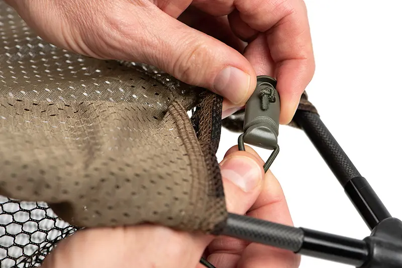 Cobertor sacadera Fox con malla de 3 mm, cordón elástico y conector seguro. Protege al pez tras el lance y es compatible con sacaderas de 42″ y 46″.