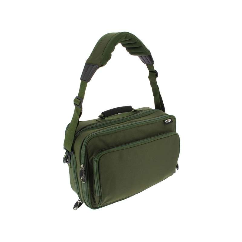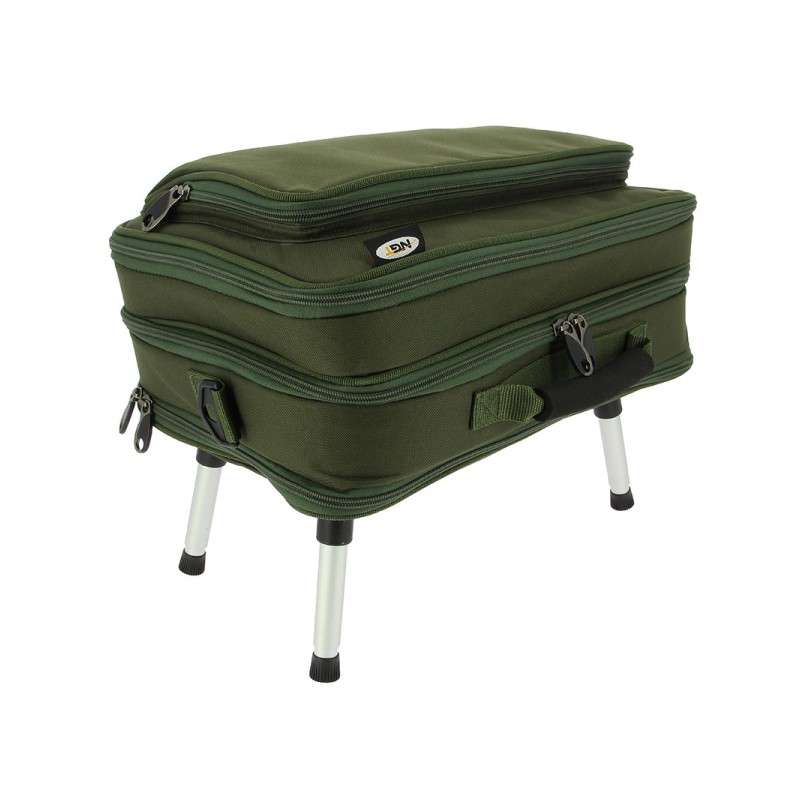 Este modelo PLUS incluye un segundo nivel de almacenamiento y un bolsillo frontal adicional con cremallera. Mantén tus aparejos organizados con su mesa bivvy desmontable de patas ajustables y la caja de aparejos con divisores incluida. Además, cuenta con una correa y un asa de transporte acolchadas para mayor comodidad.