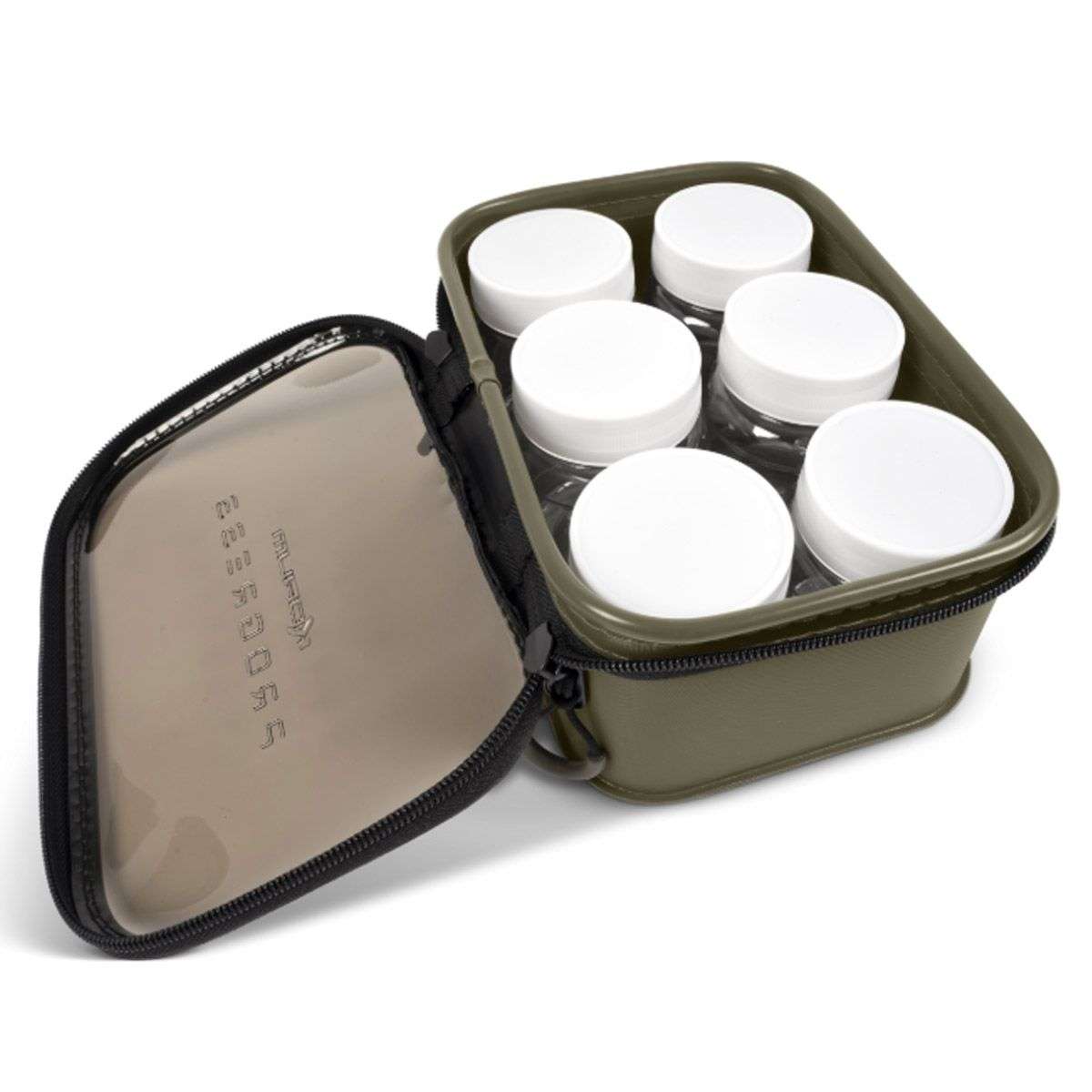 Incluye 6 botes con tapa transparente tipo gunsmoke, que permiten identificar el contenido fácilmente sin necesidad de abrirlos. Gracias a su tamaño compacto (21,5 x 15 x 10 cm), encaja perfectamente en los bolsos de la gama Korum, optimizando el espacio y el orden de tu equipo.