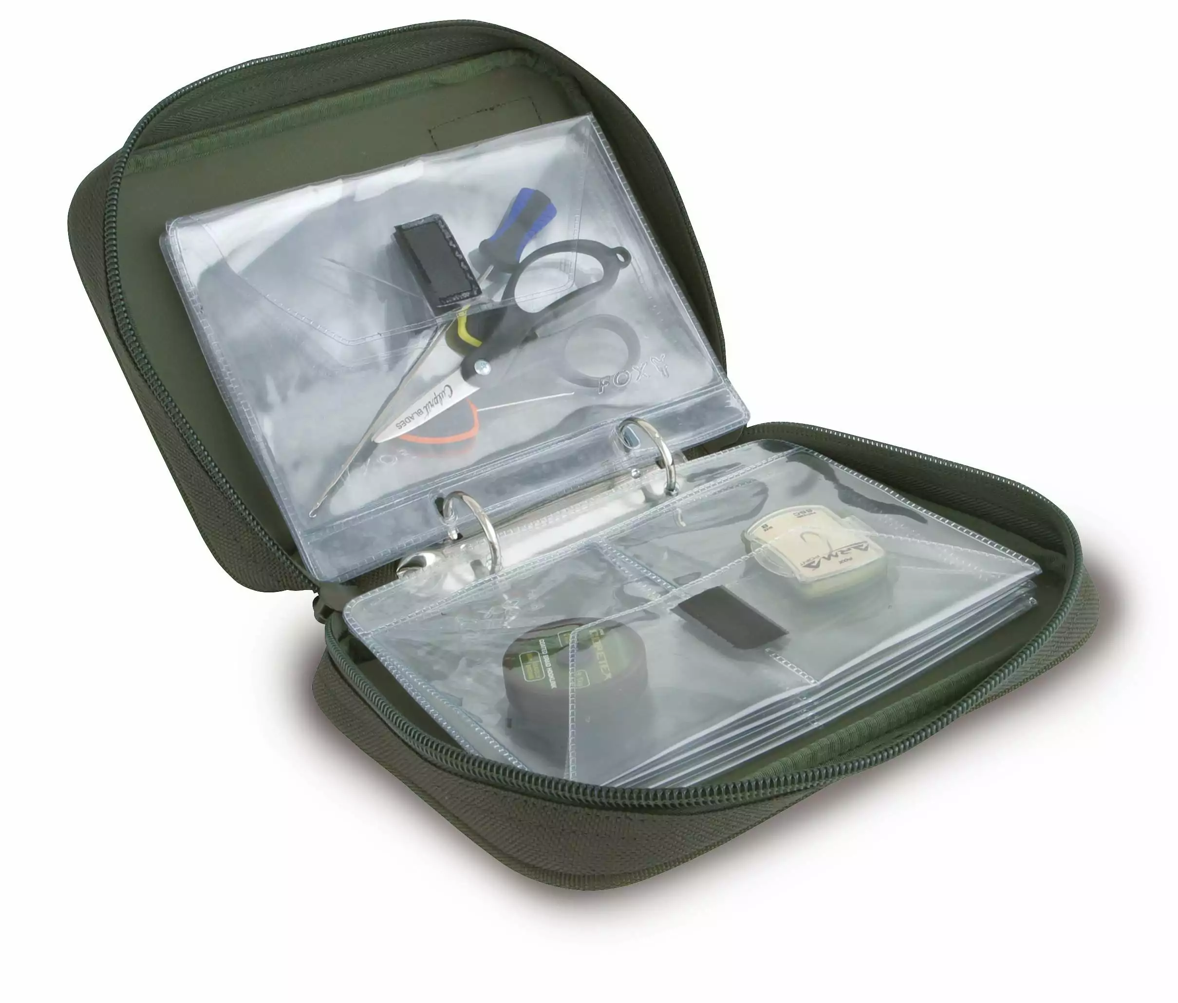 El FOX RIG WALLET, es ideal para almacenar montajes listos para usar, tijeras, hilo de cebo y otros artículos pequeños. Cuenta con 8 bolsillos de PVC transparente para almacenar montajes (4 bolsillos de un compartimento y 4 de doble compartimento).