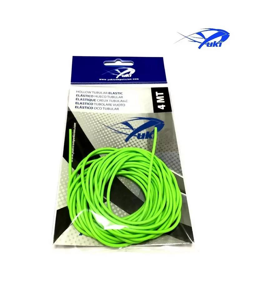 Goma Hueca Yuki Verde 2mm x 4mts: elástico micro poroso de alto rendimiento y durabilidad para pesca eficiente.