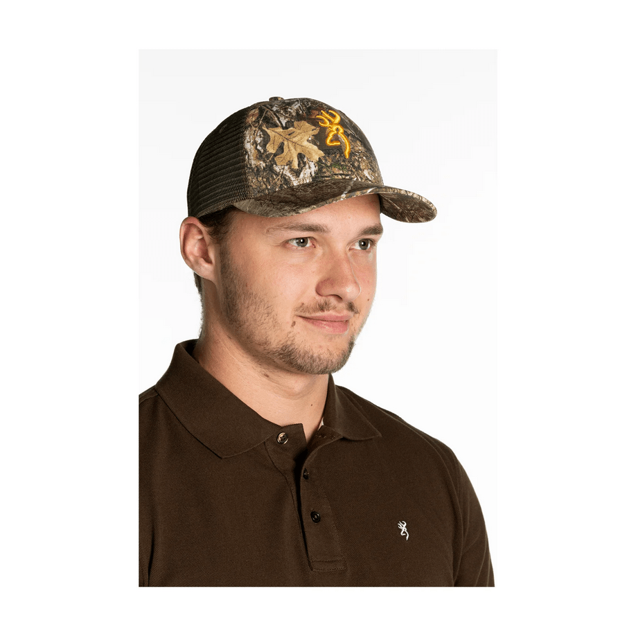 La Gorra Browning Saratoga en color Camo Realtree Edge es la elección perfecta para cualquier tipo de caza en días soleados.