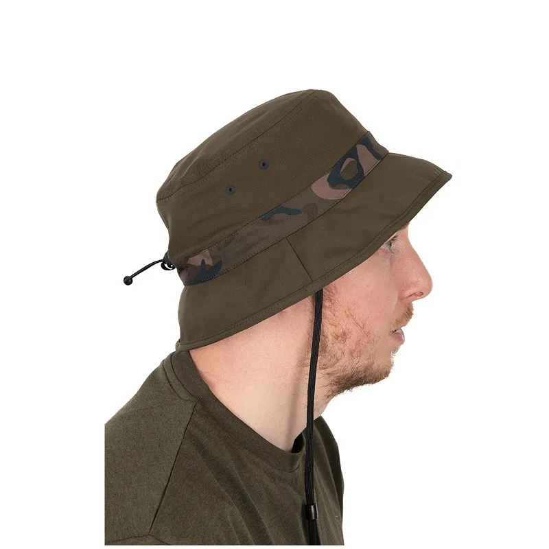 Su diseño de boina cuenta con un ala ancha que protege eficazmente tu cabeza y cuello del sol. Fabricado en color caqui y con un ribete de camuflaje, combina funcionalidad y estilo.