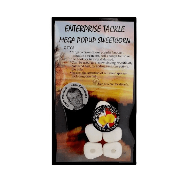 El Mega Pop-Up Maíz Blanco de Enterprise Tackle es una versión extragrande de nuestro maíz de imitación flotante. Suave para el anzuelo o la plataforma para el pelo, ofrece flexibilidad máxima en la pesca de peces cautelosos. Incluye un orificio para agregar peso o pasta, creando un cebo de hundimiento lento o críticamente equilibrado.