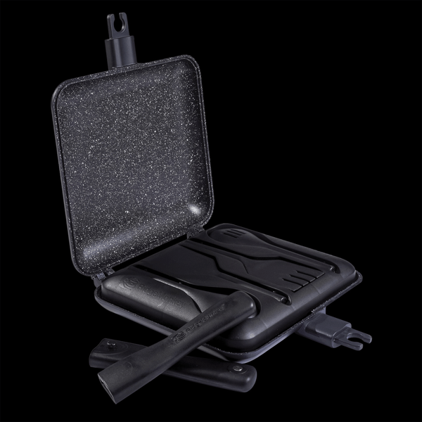 La sartén Connect XL Sandwich 10th Anniversary Edition de Ridgemonkey es una edición especial que celebra una década de cocina al aire libre con estilo y funcionalidad. Este completo set incluye dos sartenes con revestimiento antiadherente estilo granito, sistema de bisagra desmontable, asas magnéticas de tacto frío, utensilios resistentes al calor, funda protectora y estuche acolchado de transporte.