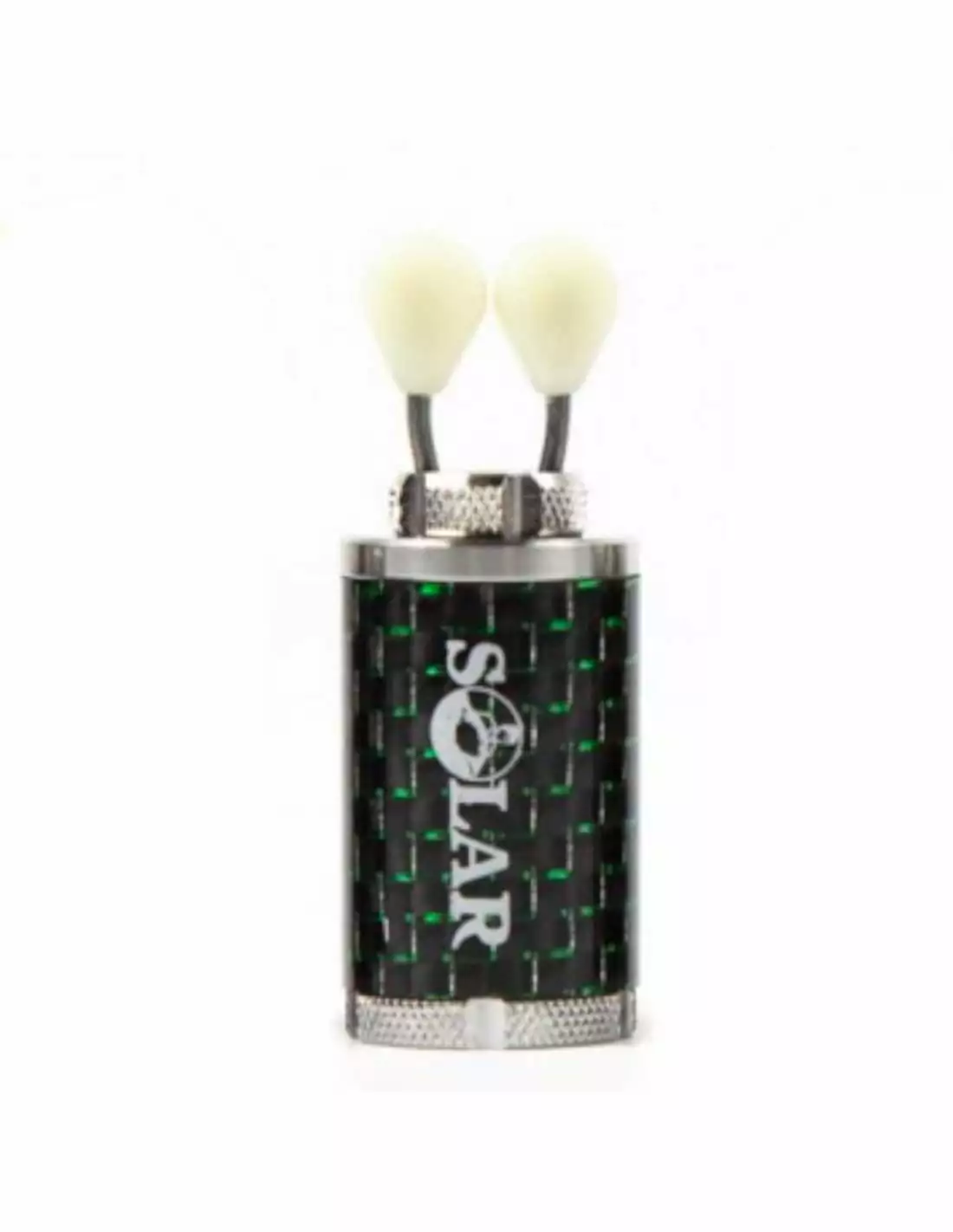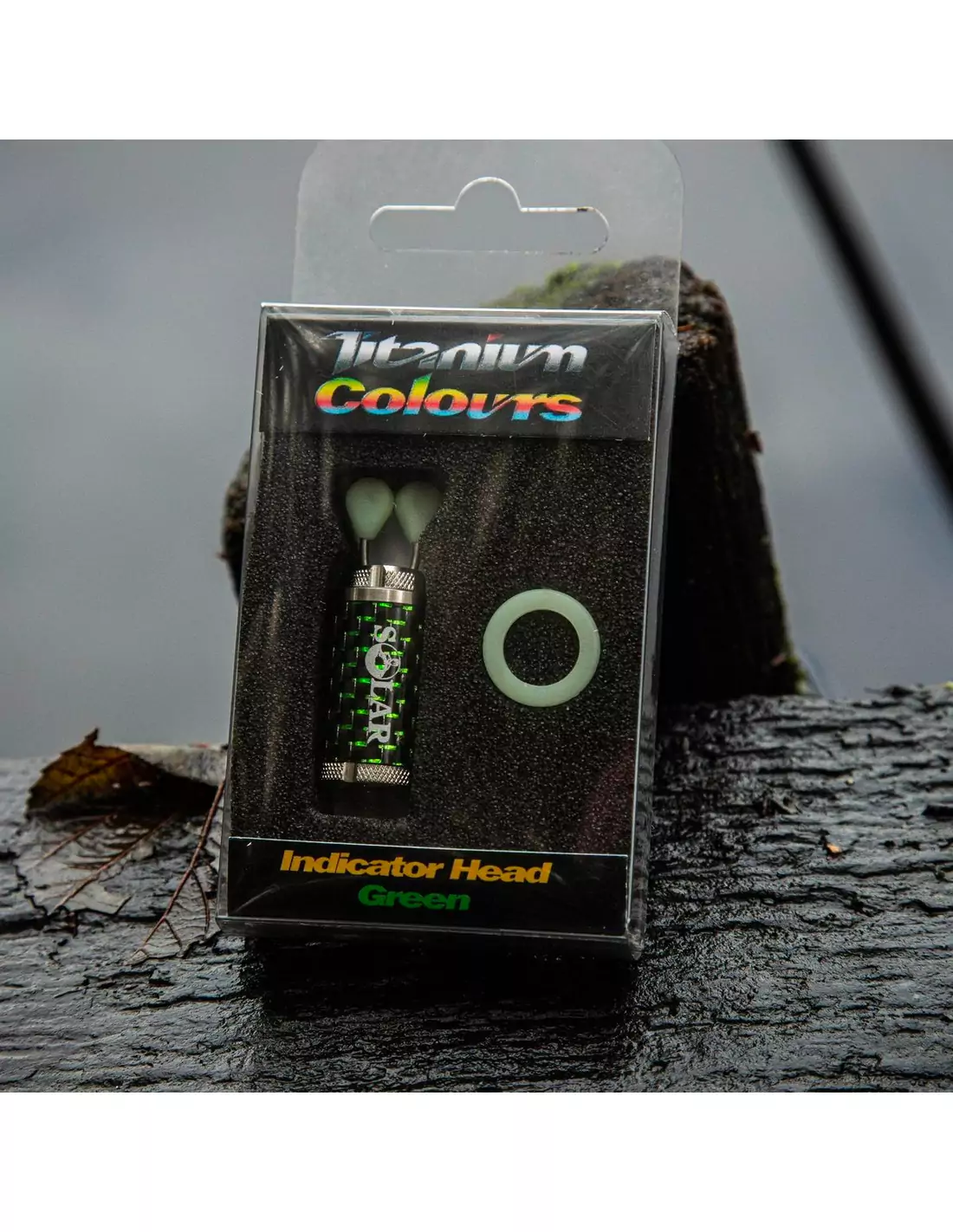 Indicador Solar Tackle Titanium Green con cuerpo de carbono iridiscente y clip Nite-Glow Line. Diseñado con precisión en acero inoxidable, ideal para detectar el más mínimo movimiento en tu línea.