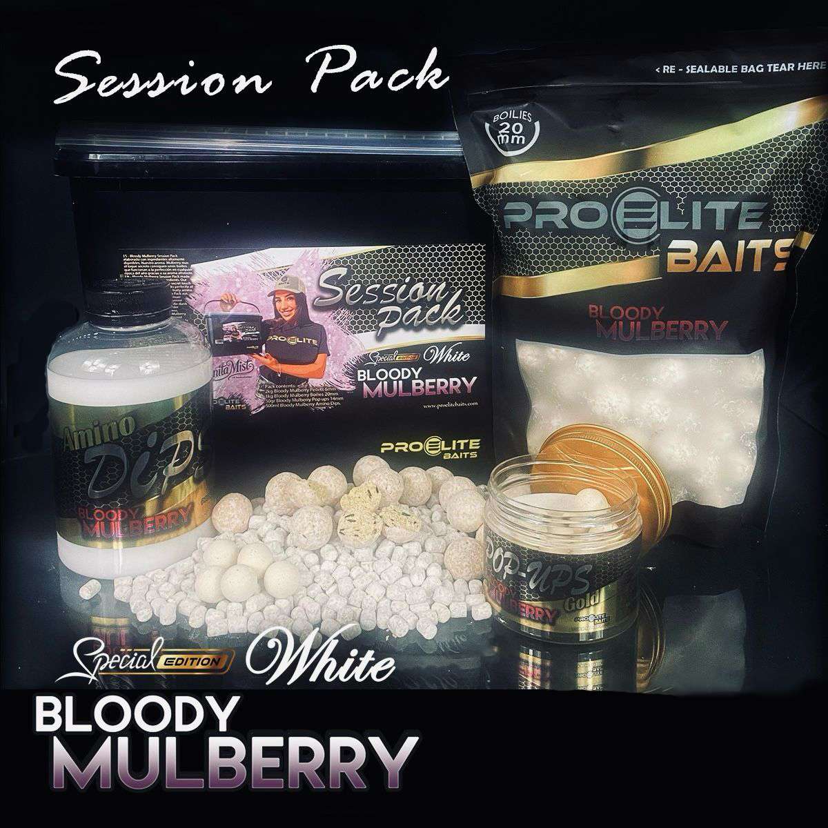 El special edition session pack white bloody mulberry es una edición exclusiva en color blanco de la reconocida gama Gold de Pro Elite Baits. Diseñado especialmente para pescadores exigentes, este pack ofrece una combinación insuperable de calidad, eficacia y presentación, ideal para sesiones cortas donde cada lance cuenta.