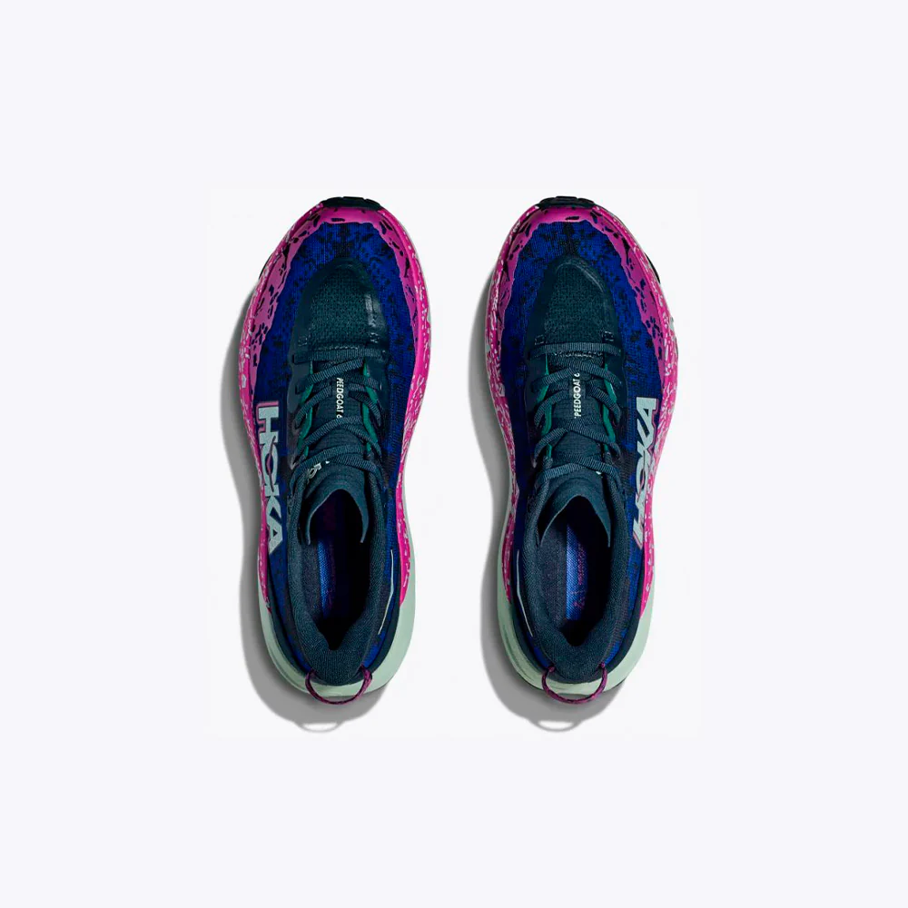 Las Speedgoat 6 para hombre de Hoka son unas zapatillas de trail running diseñadas para ofrecer una pisada con gran capacidad de respuesta y una adherencia excepcional en terrenos técnicos. Incorporan la reconocida amortiguación de HOKA, combinada con una tracción agresiva y materiales ultraligeros que garantizan rendimiento y durabilidad. Esta nueva versión mejora el empeine con tejido textil resistente, un chasis interno que se ajusta perfectamente al pie para mayor estabilidad, y una lengüeta doblemente reforzada y acolchada para comodidad. Además, su innovador diseño de tacos, inspirado en las pezuñas de cabra, optimiza el agarre en cualquier superficie. Las Speedgoat 6 son la elección definitiva para quienes buscan dominar el trail con confianza y eficacia.