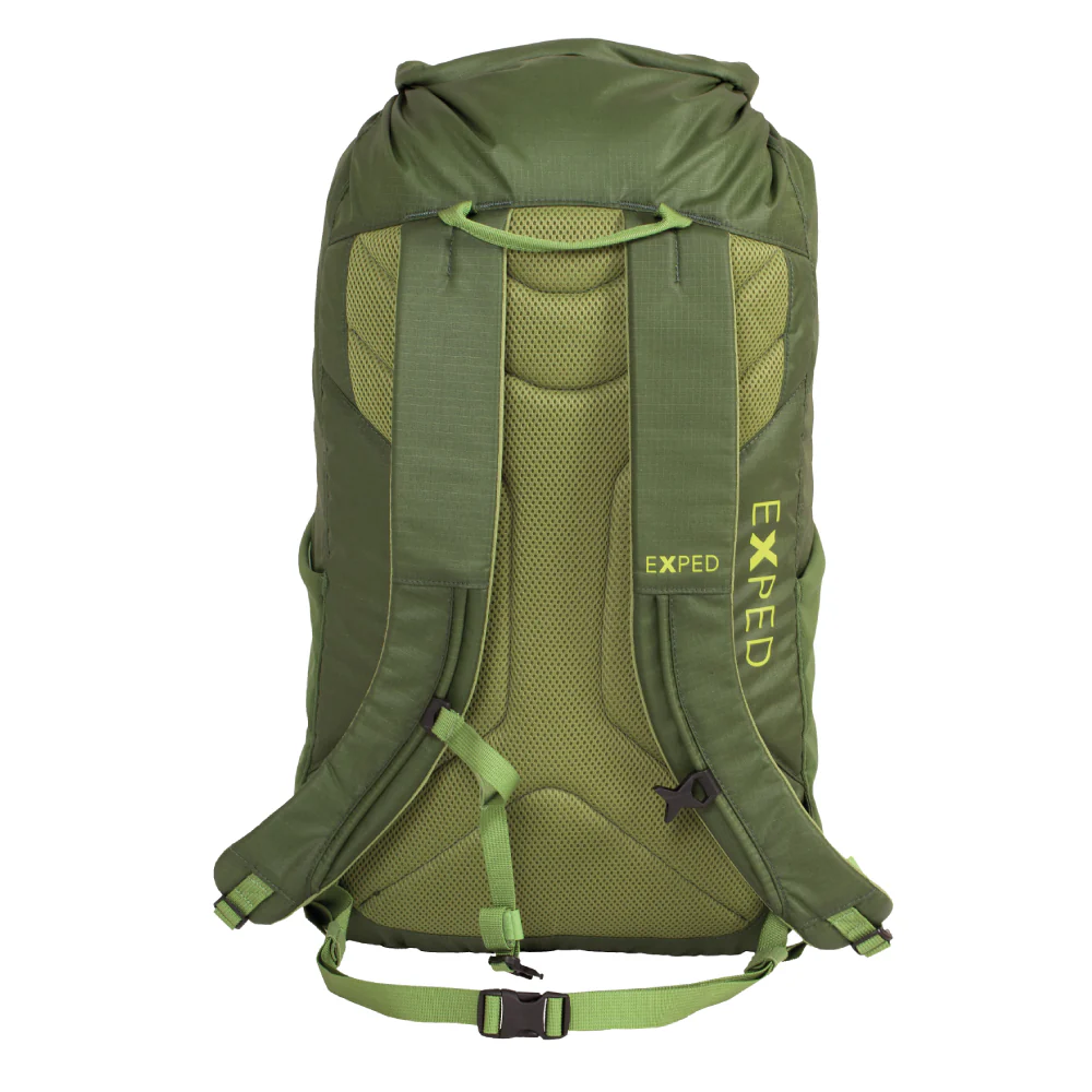 El cierre enrollable no sólo protege de forma fiable contra la lluvia, sino que también proporciona un acceso rápido al compartimento principal. Dos bolsillos laterales elásticos y cadenas tipo margarita permiten opciones adicionales de almacenamiento y fijación para equipos y otros artículos.